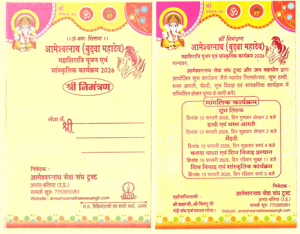 Ameshwarnath Seva Sangh is a social and cultural institution and trust. This institution has been named after Om Shri Ameshwarnath Mahadev. Om is the Shivalinga of Shri Ameshwarnath Mahadev, who is known as Baba Budhwa Mahadev. This Dham is a holy pilgrimage of Hindus. It is located in Amaon village in Ballia district of Uttar Pradesh.